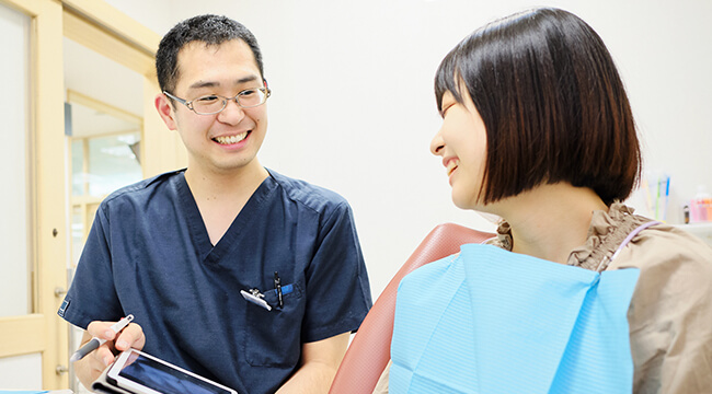 最初は現在お口の気になる症状などを担当スタッフがお聞きいたします。お悩みやご相談がある方はお気軽にご相談ください。伺ったお話をもとに治療計画を作成いたします。わからないことがある方は、ご質問もしていただけます。