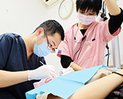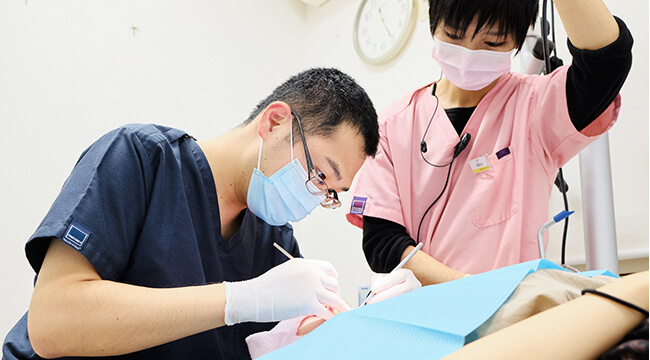 初めての方は、まずレントゲン撮影と検診を行います。 その後、衛生士による口腔内のお掃除をさせていただく場合もあれば、痛みや腫れがある場合は症状が和らぐよう処置をさせていただく場合もございます。