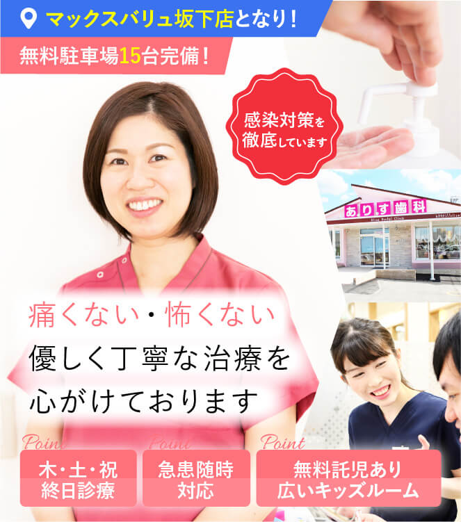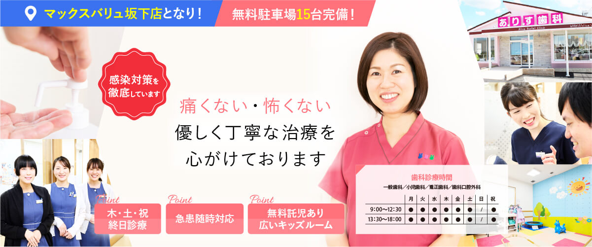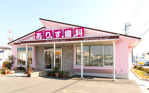 マックスバリュ坂下店の敷地内にある歯医者です。不思議の国のアリスをイメージした院内でお子さまにも気軽にご来院いただけます。駐車場は、マックスバリュさんの駐車場をご利用ください。