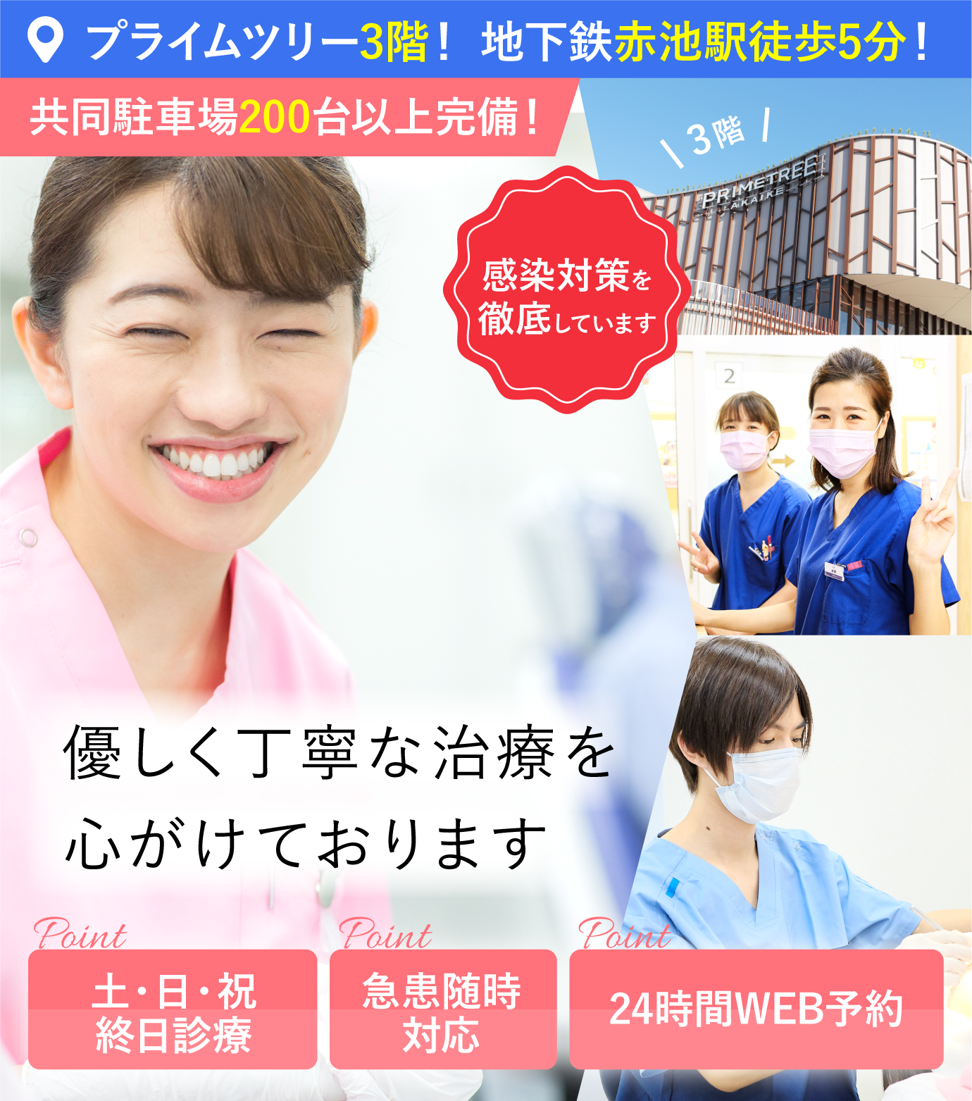 当院は地下鉄鶴舞線、赤池駅より徒歩4分、プライムツリー赤池3階にございます。土日祝日も診療しており、お子様からお年寄りの方までご家族で通っていただける歯医者です。車でお越しの方はプライムツリーの駐車場をご利用いただけます。