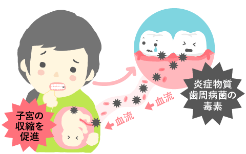 体内で分娩時期を判別するために出される炎症性物質が、歯周病の免疫反応としてふえる物質と同じため、出産の合図と間違ってしまうのが原因といわれています。