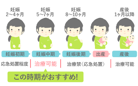 妊娠初期(1ヶ月~5ヶ月)は流産等の恐れもあるので、体に負担がかかるようであれば長時間の治療は避け、応急処置をして妊娠中期に治療を行いましょう。