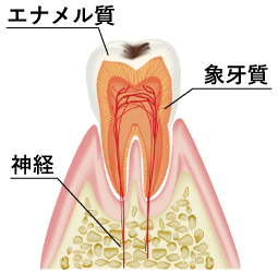 歯の表面のエナメル質の下には象牙質という層があります。象牙質の下には神経があり、神経近くまで虫歯が達していると沁みることがあります。